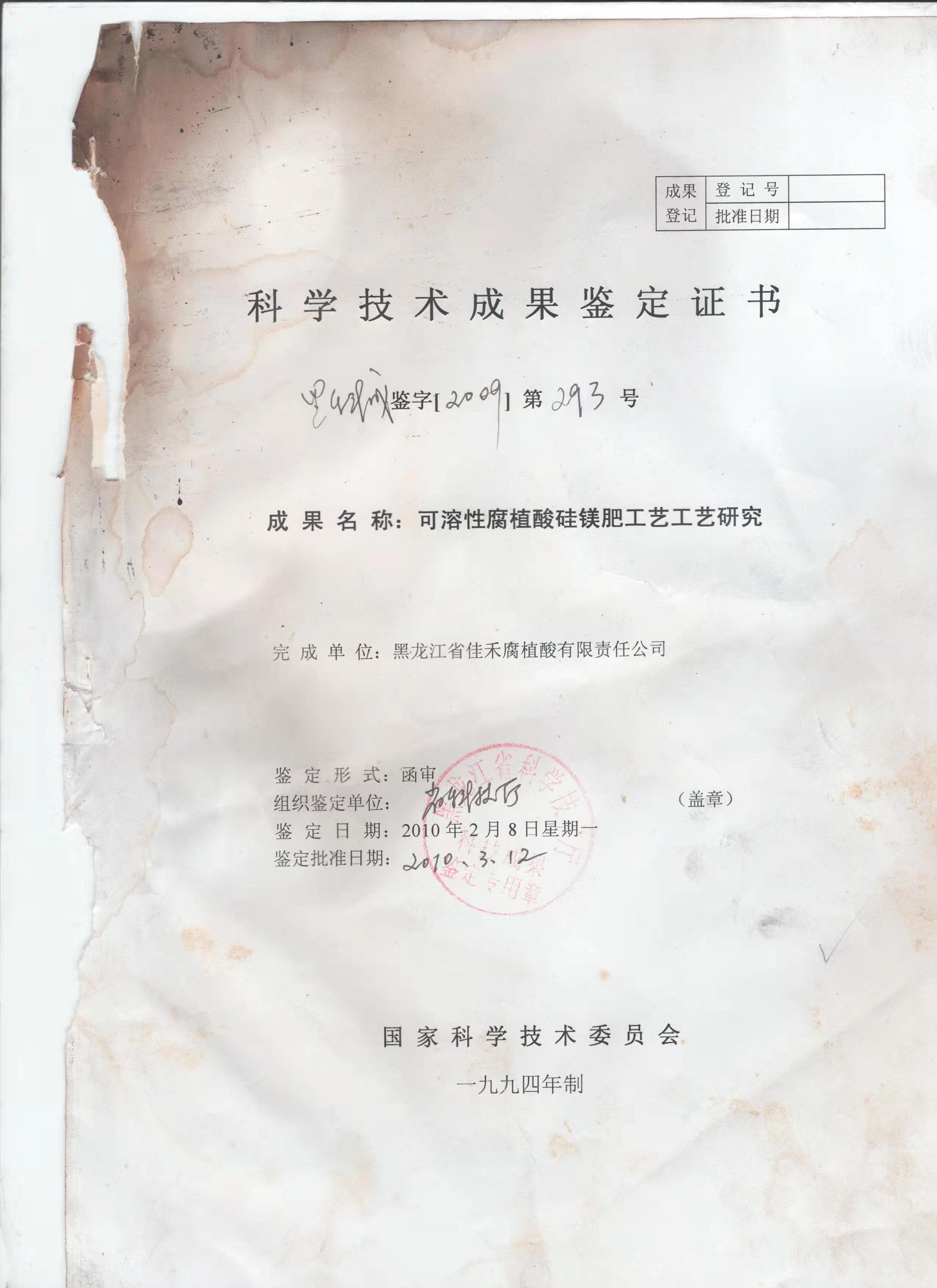 2010年可溶性腐植酸硅镁肥工艺研究通过省级科研成果鉴定